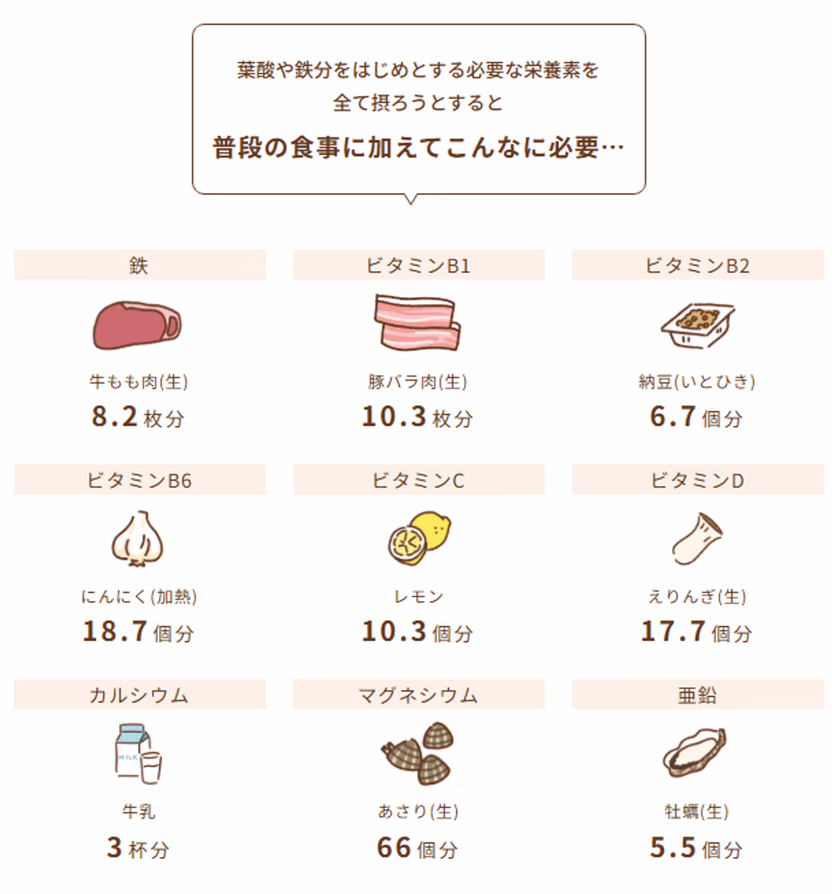 実は妊婦さんに必要な栄養素は葉酸だけではありません。妊活期に比べ鉄分がより必要になるだけでなく、ビタミン・ミネラルと様々な栄養素をまんべんなく摂ることが大切です。