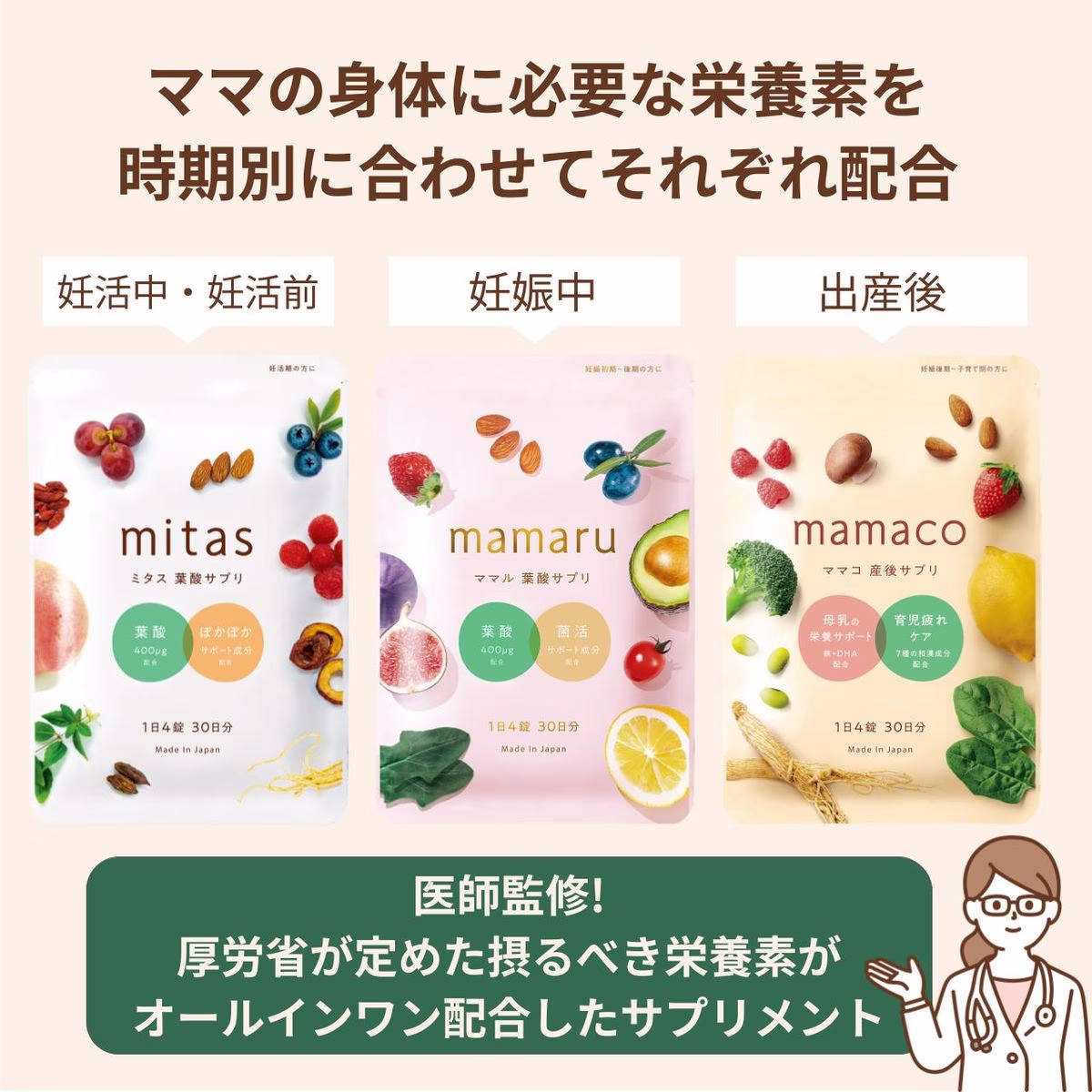 mamaruは、時期別に葉酸サプリを展開しているmitasシリーズのひとつ。続けやすいと人気の葉酸サプリです。