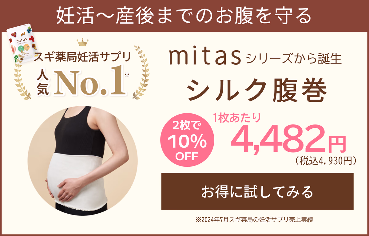 また、お腹が冷えると体全体の冷えにもつながるため、腹巻きを取り入れるのも効果的。なかでもおすすめの腹巻は、マタニティ期の温活を長年サポートしてきた「mitasシリーズ」のシルク腹巻です。