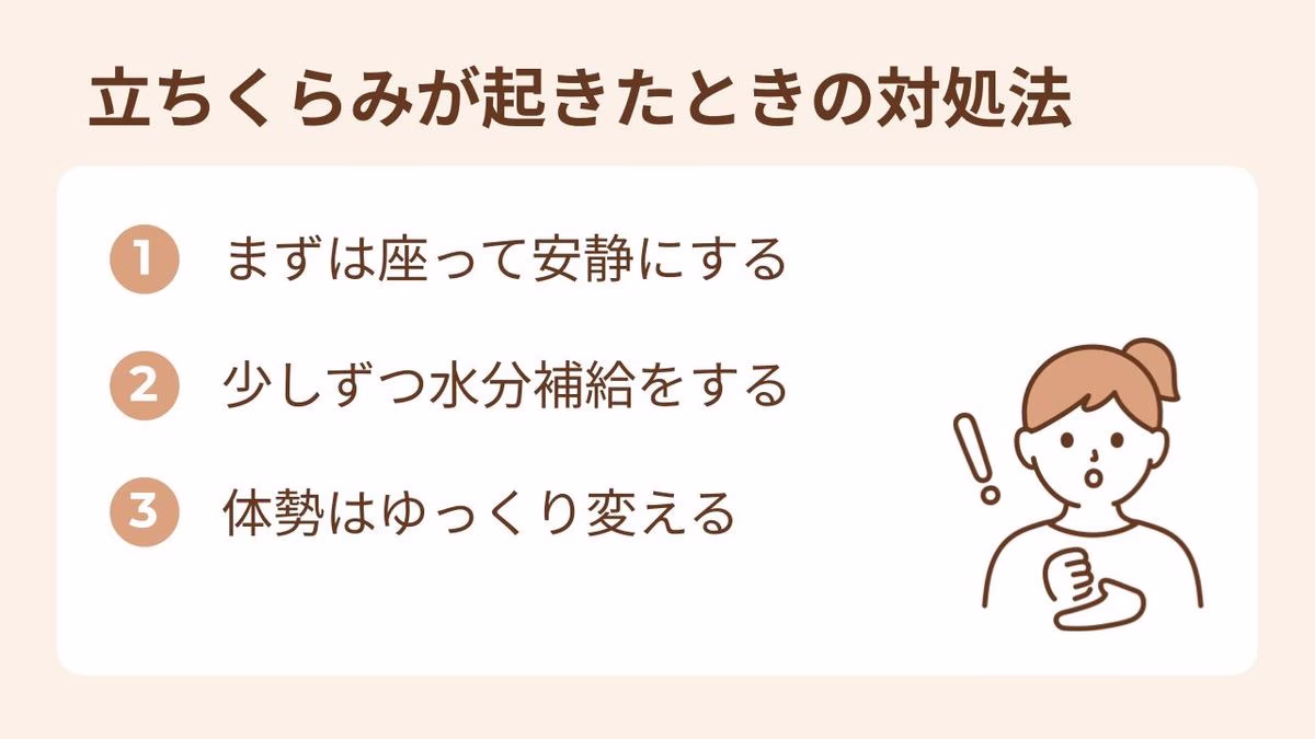 立ちくらみの原因と対処法を知ることで、立ちくらみが起きてしまったときも冷静に応急処置ができるようにしておきましょう。
