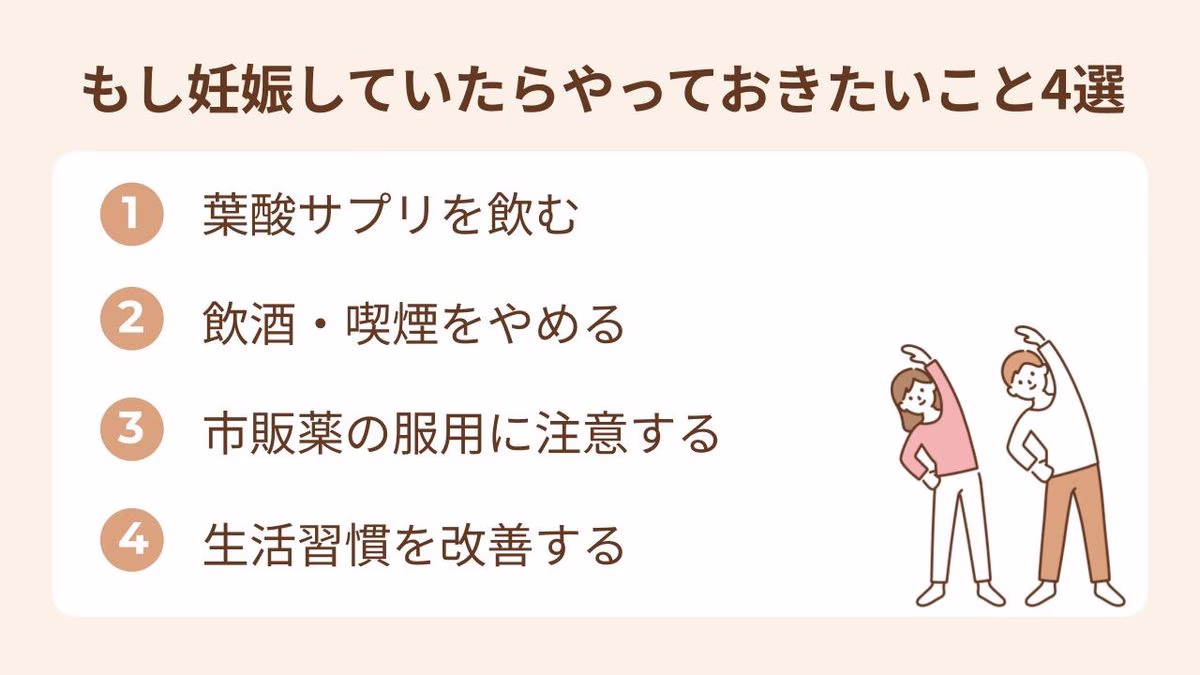 妊娠している可能性がある場合は、飲酒や喫煙は控えて、できるだけ生活習慣を整えることをおすすめします。