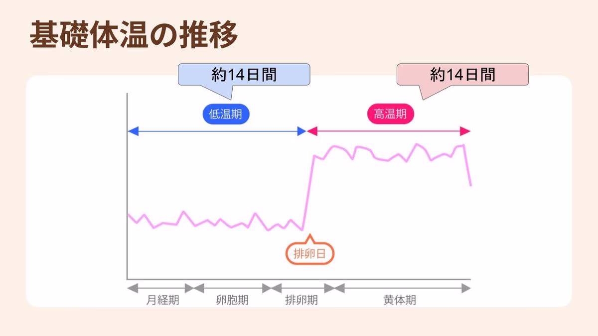 女性の体温は、排卵前の低温期と排卵後の高温期に分かれています。高温期は排卵後に分泌される黄体ホルモンの影響で体温が上昇しますが、この期間は約2週間で終わります。