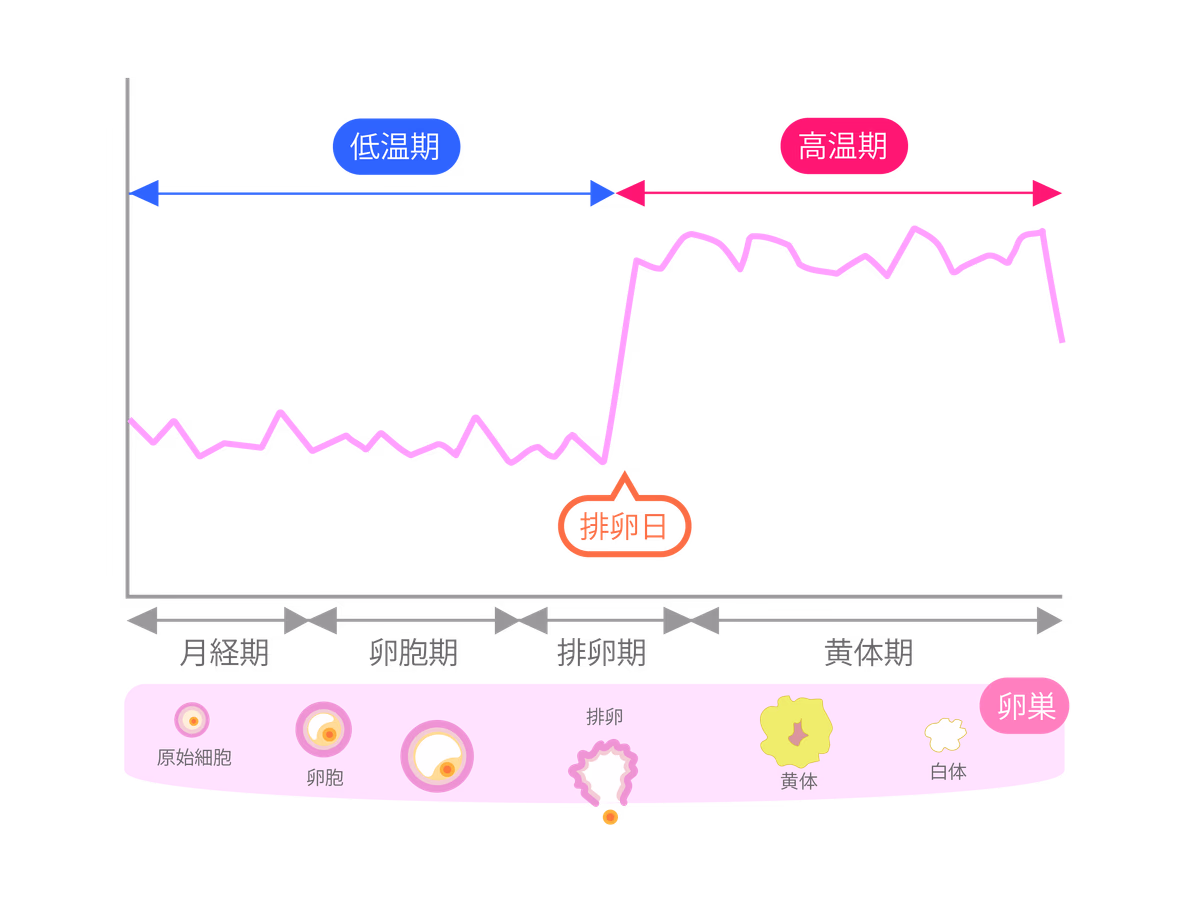 通常、基礎体温は月経周期が28日の場合、低温期が約14日続いた後に高温期が約14日続きます。