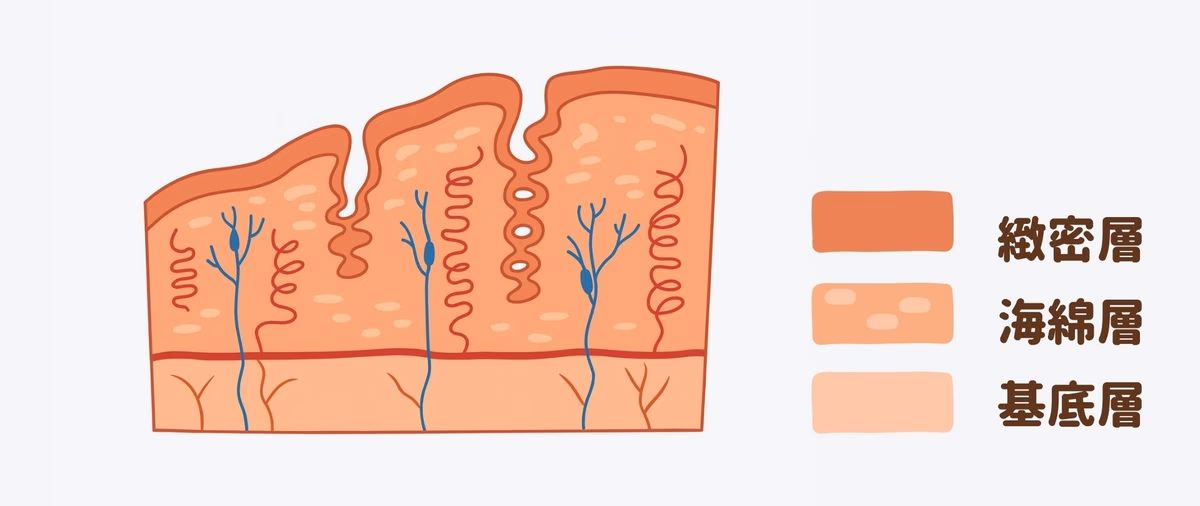 しかし、実際には血液を多く含む粘膜組織でできており、「機能層」と「基底層」の2層構造で、機能層はさらに「緻密層」と「海綿層」2つの層に分類され、これらが月経のときに剥がれ落ちます。