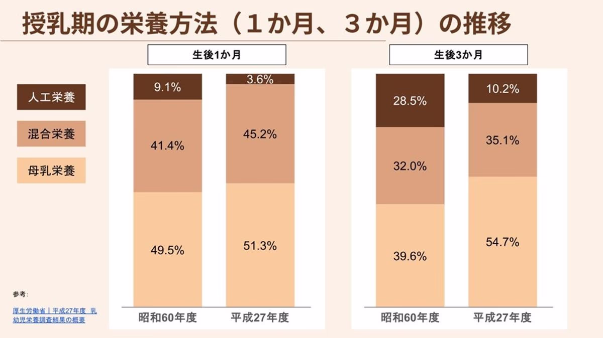 昭和60年度の完母の割合は、【生後1か月で49.5%】【生後3か月で39.6%】だったことから、母乳で育てる割合は増加傾向にあることが分かります。