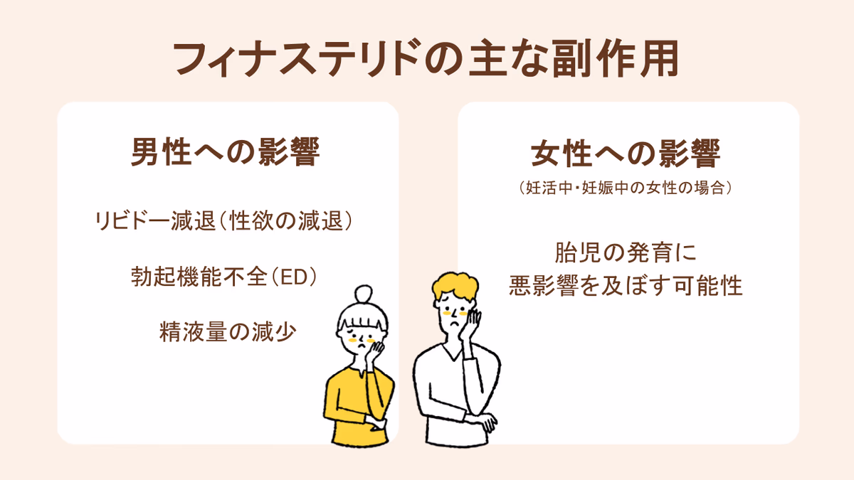 フィナステリドの服用により、男性に現れる可能性のある影響はさまざまです。副作用には個人差があり、必ずしもすべての方に当てはまるわけではありませんが、妊活中の男性に影響を及ぼすと考えられる副作用を紹介します。