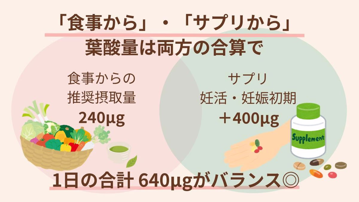 このように国の基準として、妊活を意識したときから「食事から240μg、サプリから400μgの葉酸」を摂ることが、厚生労働省から示されています。