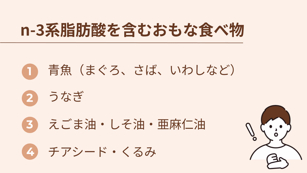 n-3系脂肪酸にはDHA(ドコサヘキサエン酸)やIPA(イコサペンタエン酸)、α-リノレン酸などがあり、精子の運動率の向上や正常な精子の数を増やすことに役立つといわれています。