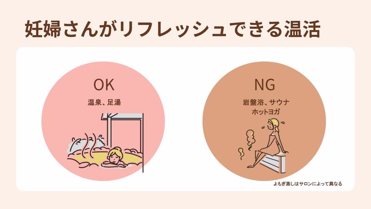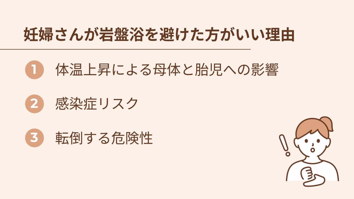 しかし、岩盤浴は「体温上昇による母体と胎児への影響」「感染症のリスク」「転倒する危険性」という観点から、母子ともにリスクがあるため避けた方がいいでしょう。