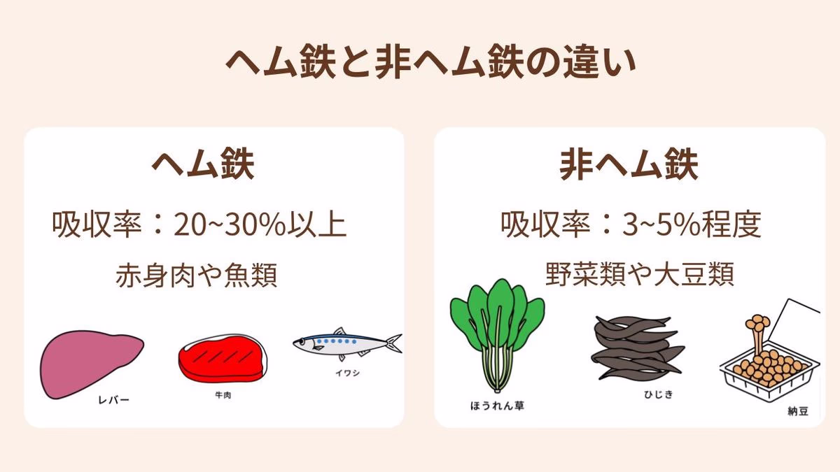 非ヘム鉄は体に吸収されにくいため、ビタミンCやタンパク質と一緒に摂るなどの工夫が必要です。