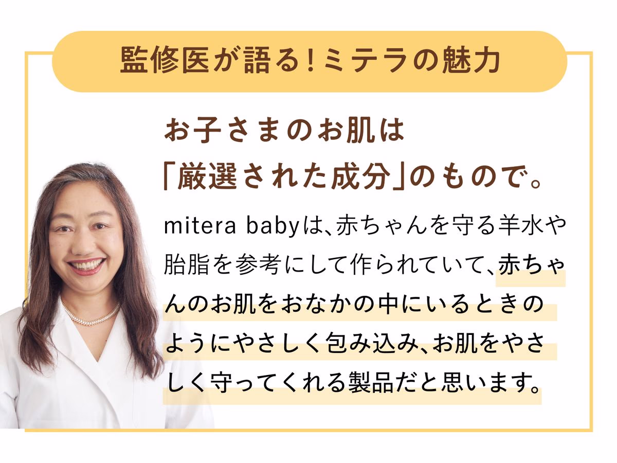 天然由来の成分でできているmiteraシリーズで、「やさしく」「ていねい」に洗い、「しっとり」と保湿して、敏感な赤ちゃんの肌を守ってあげましょう。