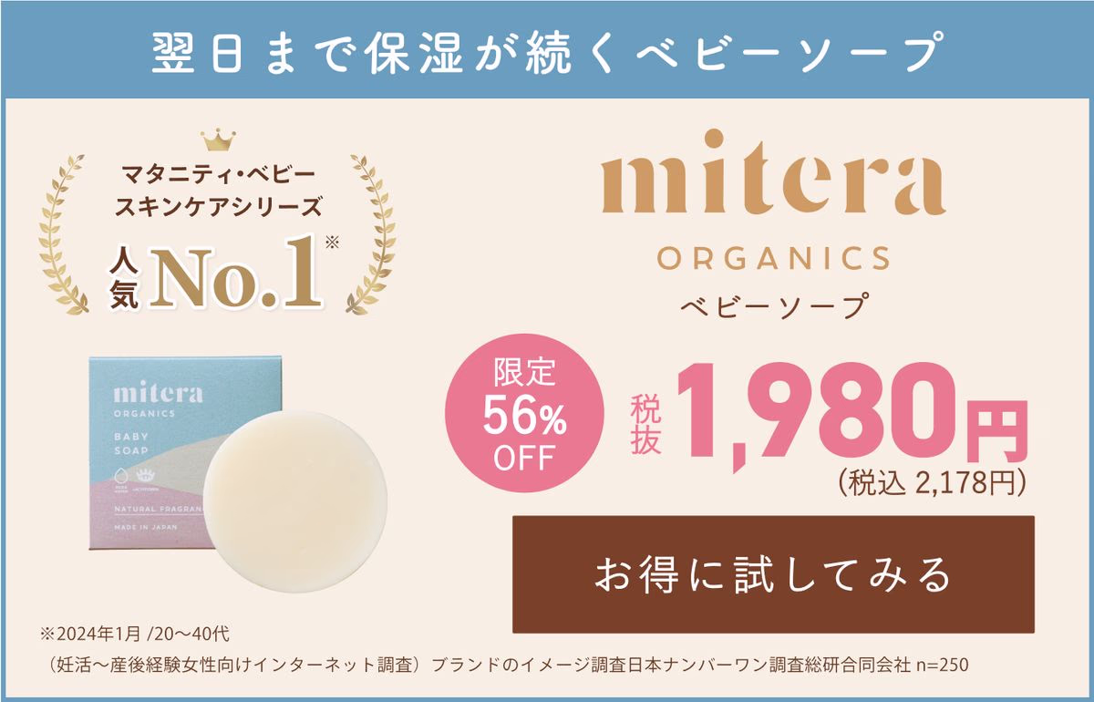 赤ちゃんをやさしく、しっとりと洗うことができるベビーソープなら「mitera baby soap(ミテラベビーソープ)」がおすすめです。