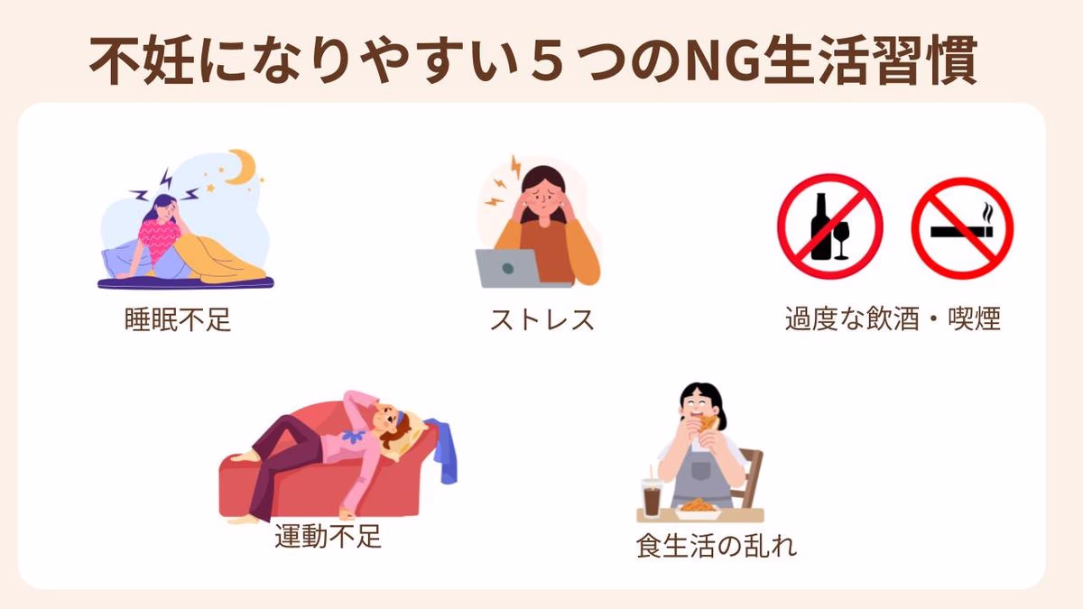 不妊にはさまざまな原因がありますが、日々の生活習慣が影響している可能性もあります。まずは次の5つの習慣を見直してみましょう。