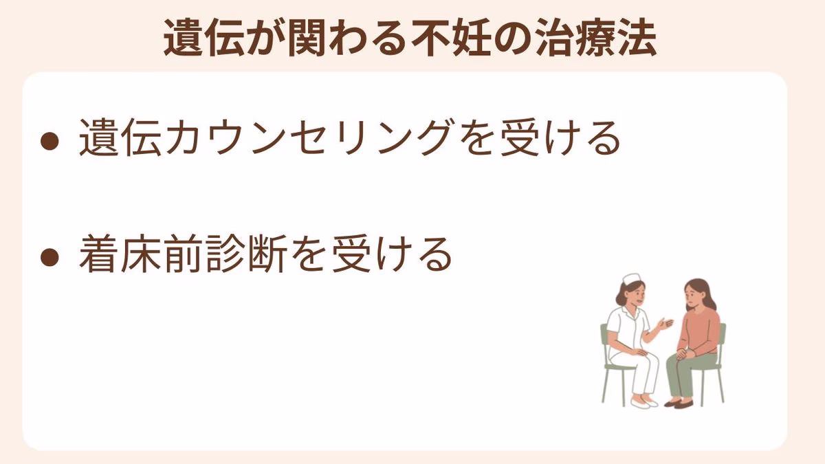 不妊原因に遺伝が関わる場合、どんな治療法があるのか不安になる方も多いでしょう。遺伝そのものを変えることはできませんが、検討される主な対応について紹介します。