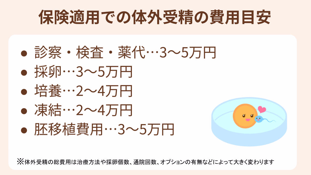 体外受精とは、体外で卵子と精子を受精する治療法です。一連の流れでかかる費用は以下の通りです。1周期あたり、約10〜20万円ほどが目安になります。