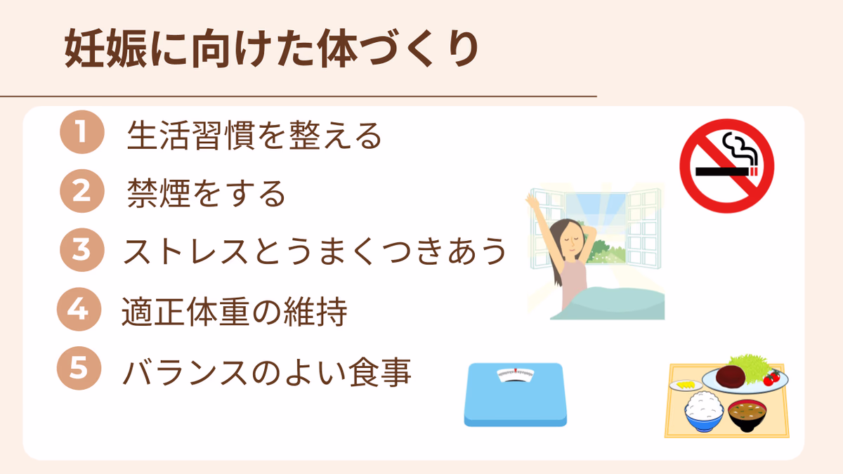 何歳で妊活を始めるとしても、生活習慣を見直して、妊娠に向けたカラダづくりをすることが大切です。普段の生活では、以下のことを意識してみましょう。