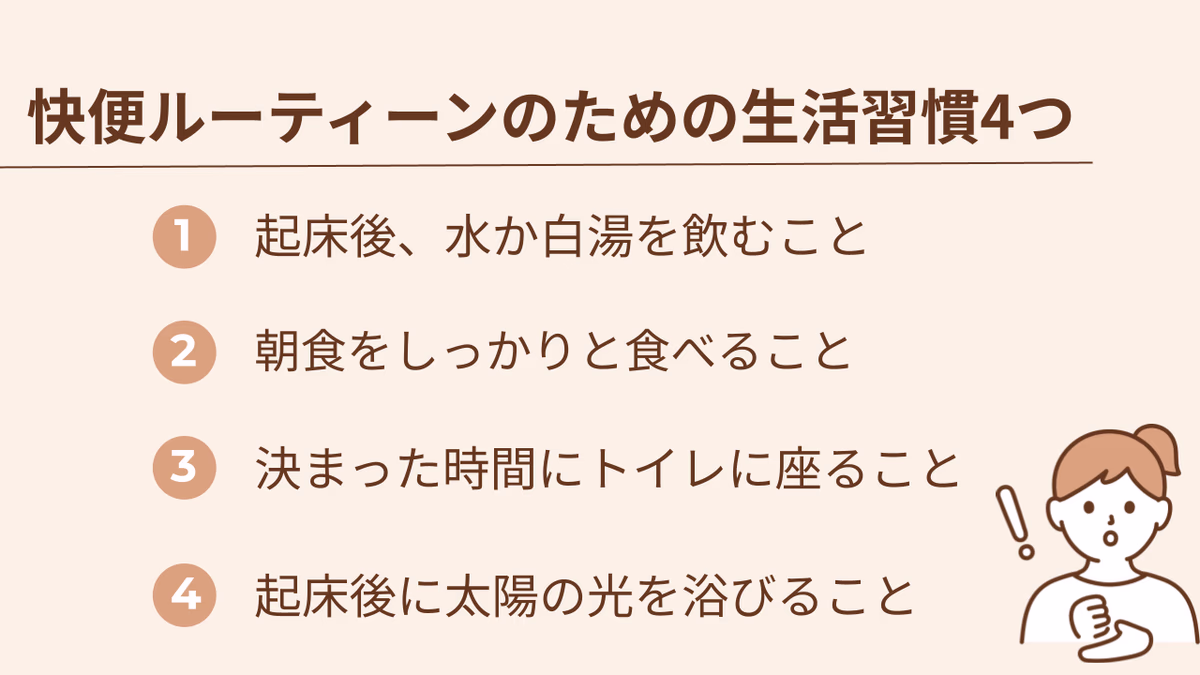 そんな快便ルーティーンを作るためには、4つの習慣を取り入れてみましょう。