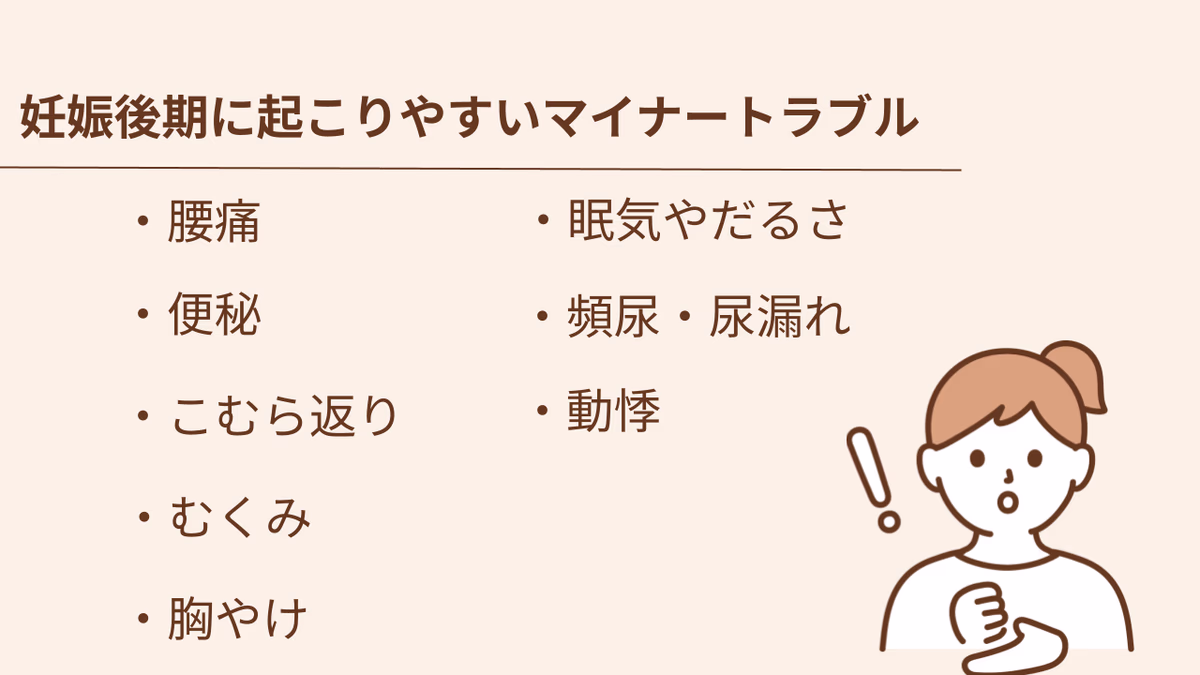 マイナートラブルの症状が出る時期は人によってさまざまですが、妊娠後期になるとほとんどの人が何かしらの不調を感じることが多いはず。