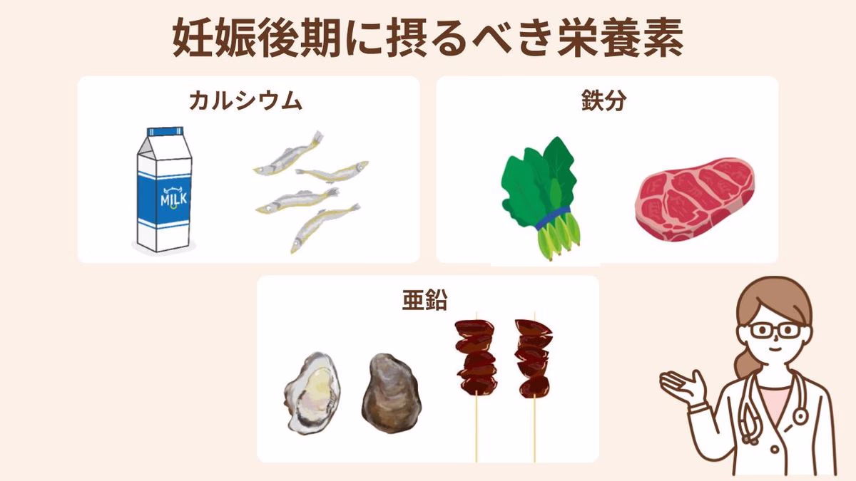 - 妊娠後期は、葉酸に加えカルシウム、鉄分、亜鉛の摂取も意識する