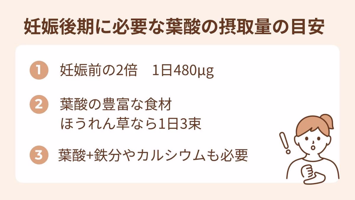 - 妊娠後期は、血液量の増加や出産・産後に備えて葉酸の摂取が必要