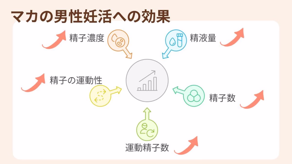 ある研究では、マカを摂取したグループはそうでないグループと比べて「精液量」「射精あたりの精子数」「運動精子数」「精子の運動性」のすべてが増加したと報告されています。(※4)