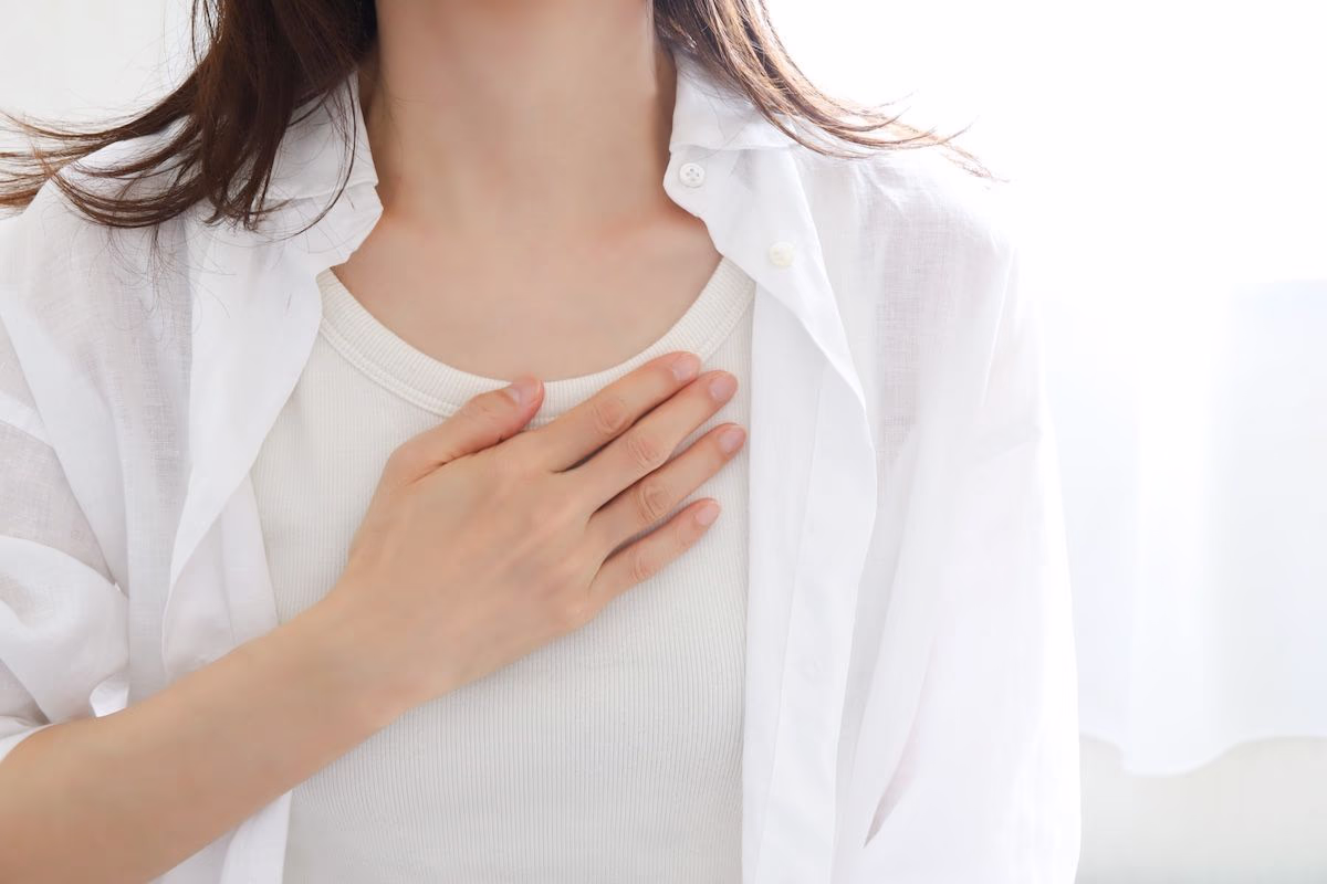 呑気症による空気の滞留や、胃腸の収縮運動が弱まることで、胸の張りや息苦しさにつながることがあります。