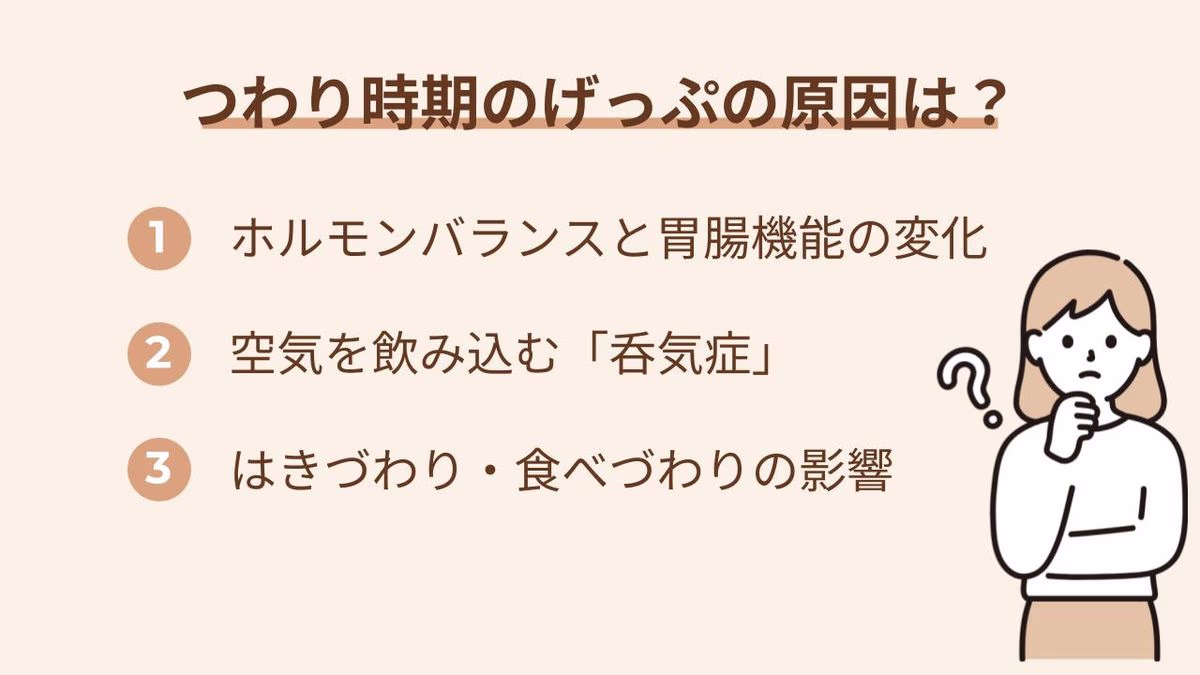 つわり時期にげっぷが出やすくなる主な原因は、「ホルモンによる胃腸の動きの変化」「空気の飲み込み(呑気症)」「つわりそのもの」の3つの影響が重なって起こります。