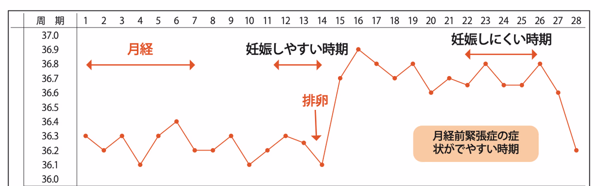 生理周期が28日の場合、生理が始まって14日後に体温が上がる(=排卵日)メカニズムです。以下の手順にそって基礎体温を測りましょう。