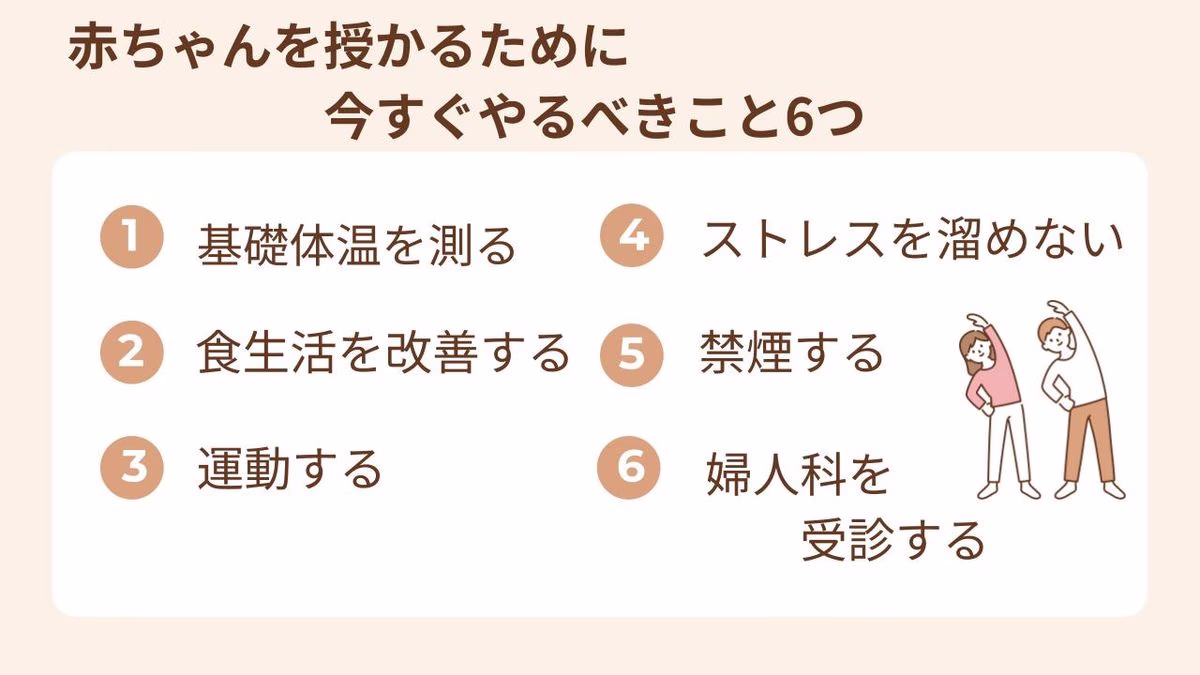 これから妊活を始める方は、赤ちゃんを授かりやすい体づくりのために、次の6つを意識してみましょう。