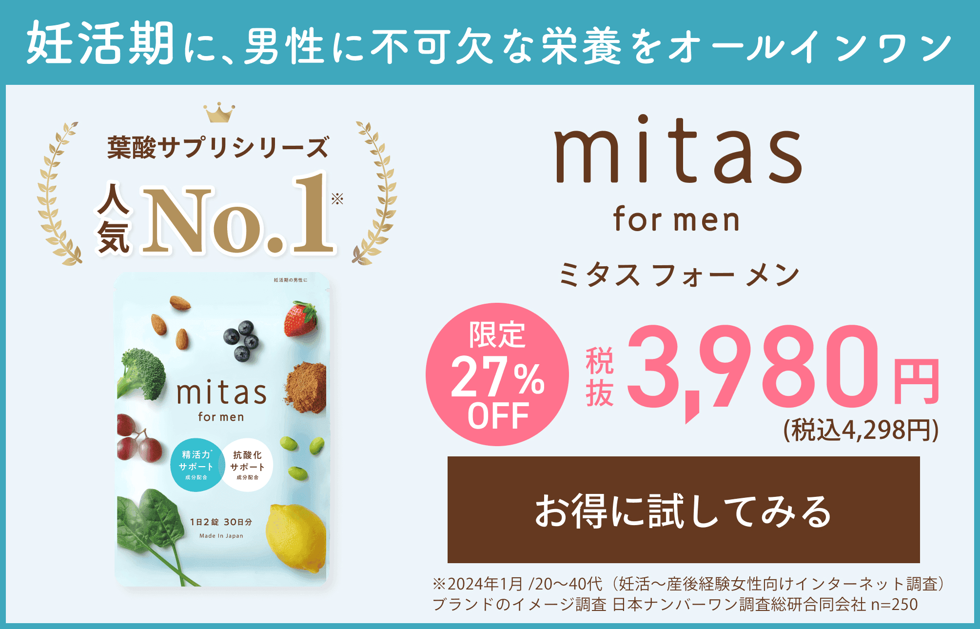 葉酸の他にも、亜鉛・マカ・抗酸化成分などは男性のカラダに影響を与え、精子の質や性機能を高めてくれます。mitasシリーズの『mitas for men(ミタスフォーメン)』は、妊活中の男性に不足しがちな栄養素を、ギュッと一つに凝縮したサプリメント。葉酸、亜鉛、マカ、抗酸化成分を効率的に摂取できますよ。