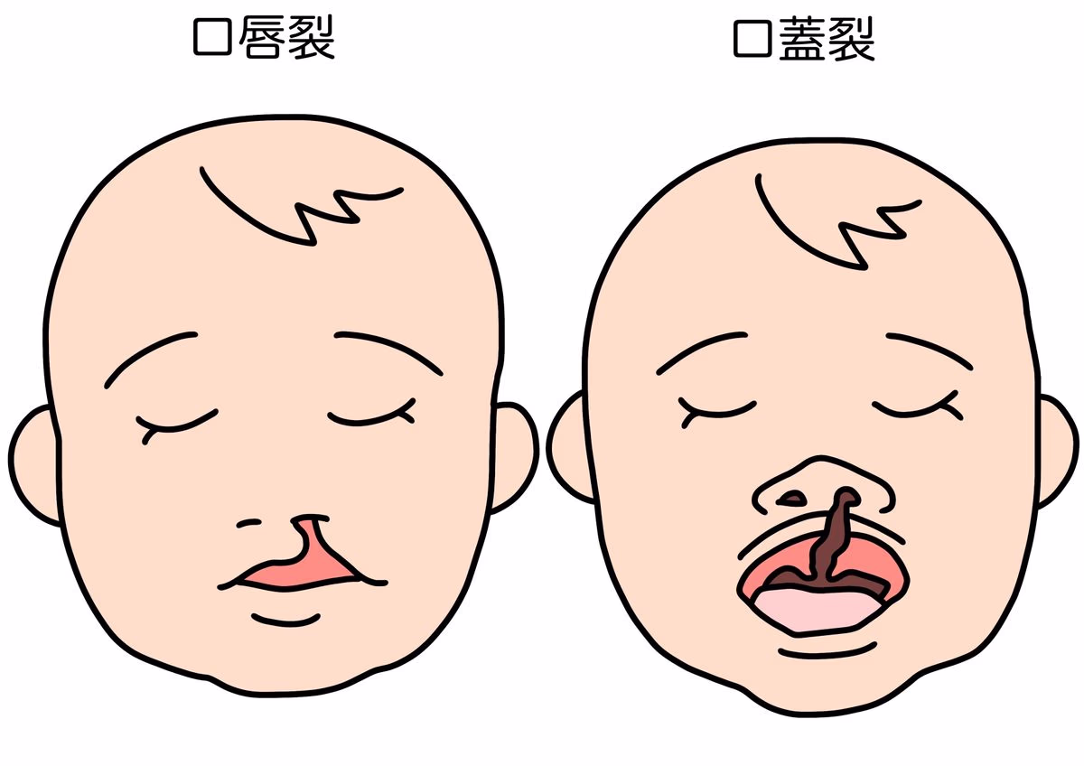 口唇裂・口蓋裂とは、赤ちゃんの先天性異常のひとつです。器官形成期に組織の欠損や融合不全によって、口唇や口蓋(口の中の天井の部分)などに割れ目が残ってしまったものをいいます。