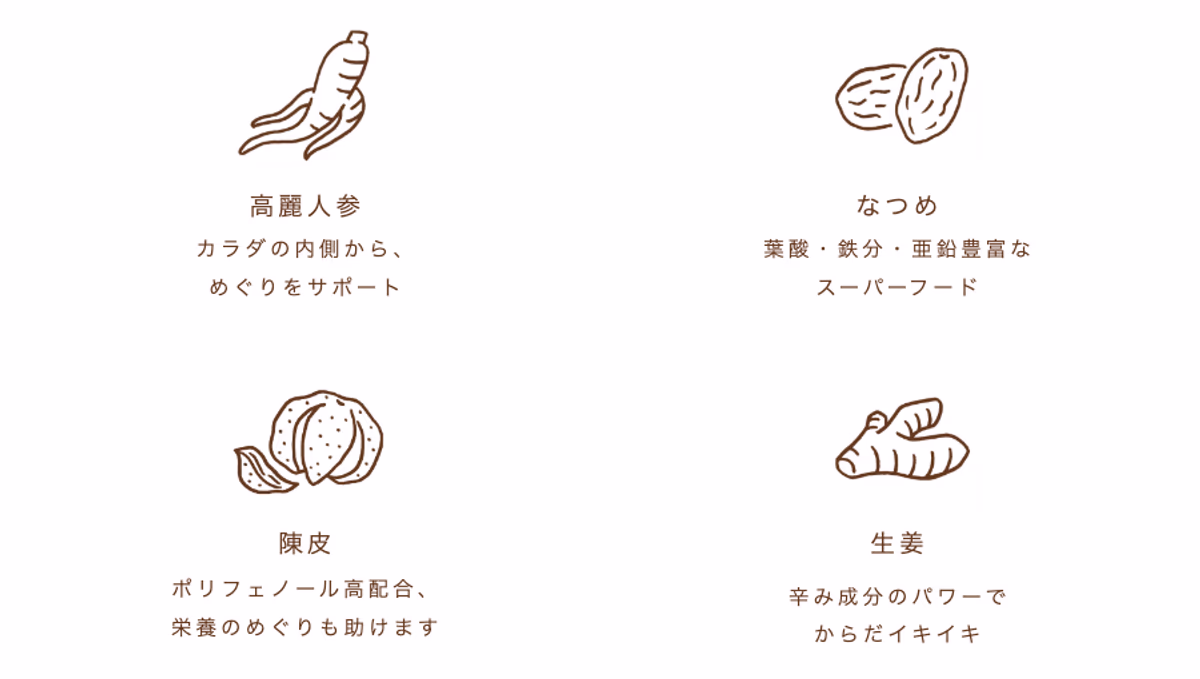 また、冷えにアプローチし、体内の巡りを整える和漢植物も配合しています。