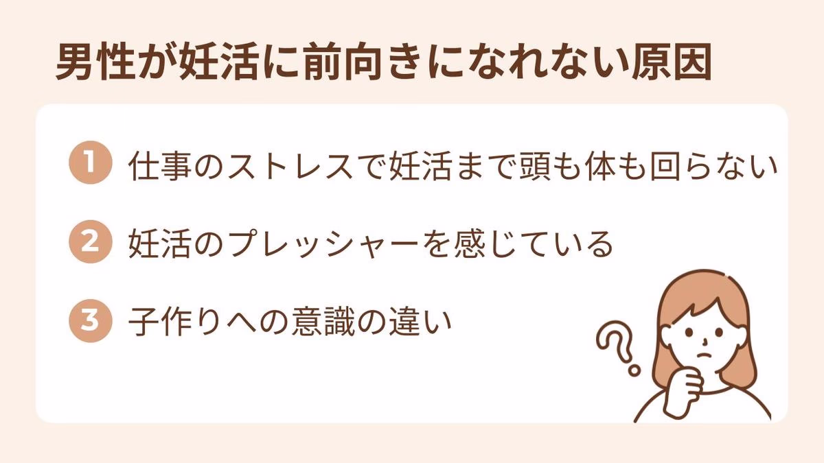 とはいえ、男性が妊活に前向きになれないのには理由がある場合もあります。例えば、忙しくて妊活のことを考えられない、そもそもまだ子供は欲しくないという場合も。