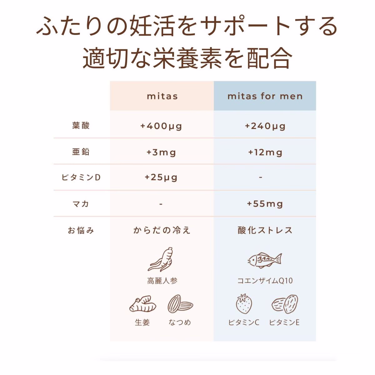 やる気がない旦那さんも、妊活の第一歩として手軽に始められるサプリ習慣。男性はmitas for men、女性はmitasで、気持ちをそろえながら妊活をスタートしてみませんか?
