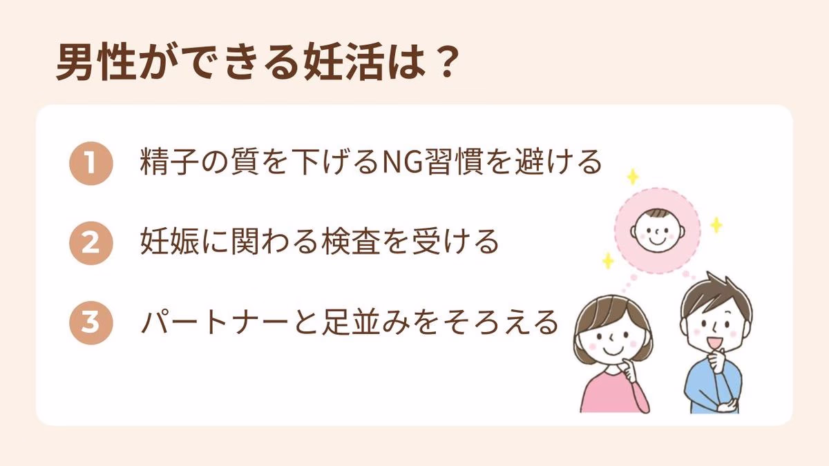 妊活の主体は女性になりがちですが、男性も妊活でやるべきことはたくさんあります。妊活はパートナーと足並みをそろえて、二人でできることからはじめることが大切です。