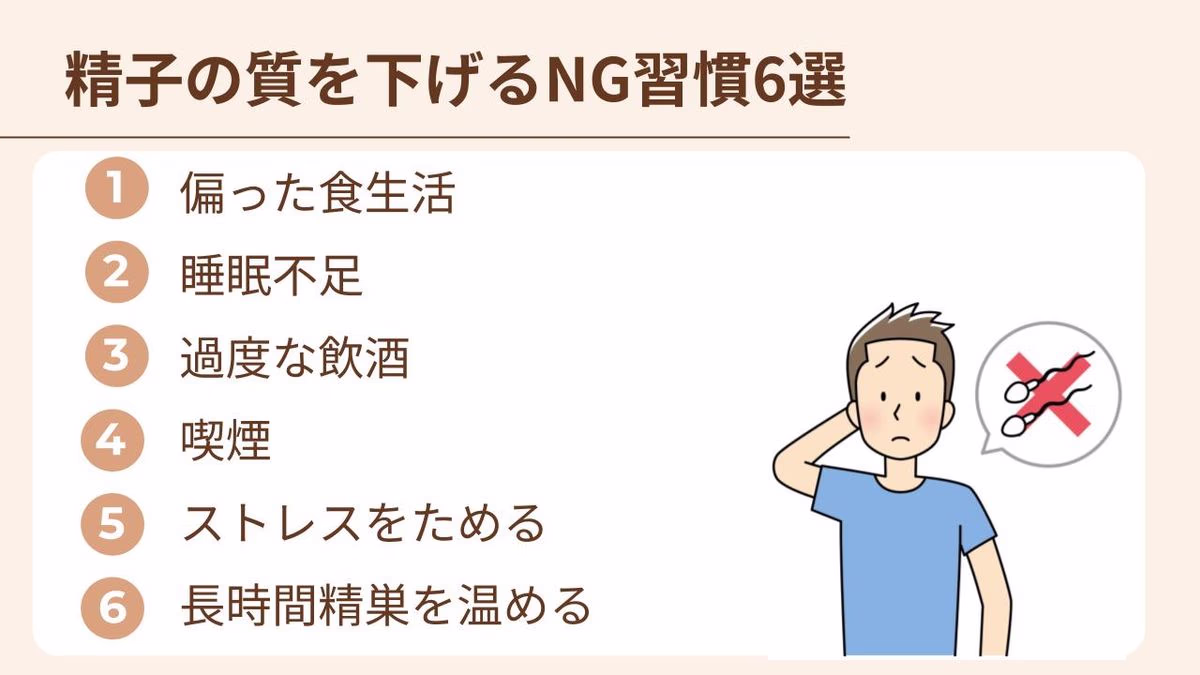 睡眠不足は精子の質に悪影響を与える可能性があるため、少なくとも6時間以上の睡眠を心掛けましょう。