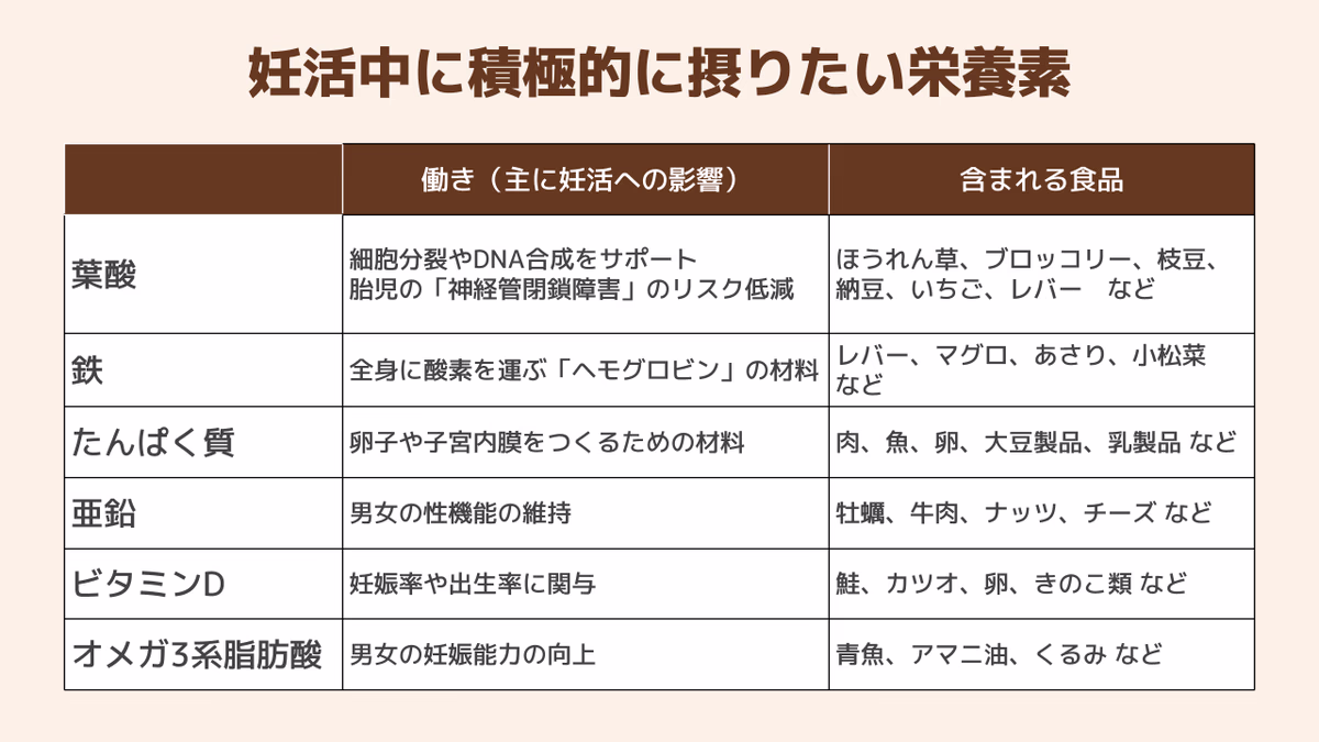 まずは、妊活中に特に意識したい6つの栄養素と、効率よく取り入れるための食べ物をご紹介します。
