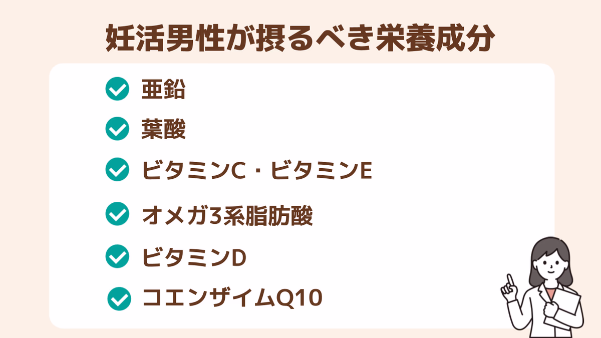 亜鉛や葉酸は精子の形成に関与し、ビタミンCやビタミンE、オメガ3系脂肪酸は、精子を酸化ストレスから守る働きが期待されています。ビタミンDやコエンザイムQ10も、精子の質を高める可能性が示唆されています。