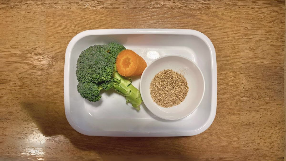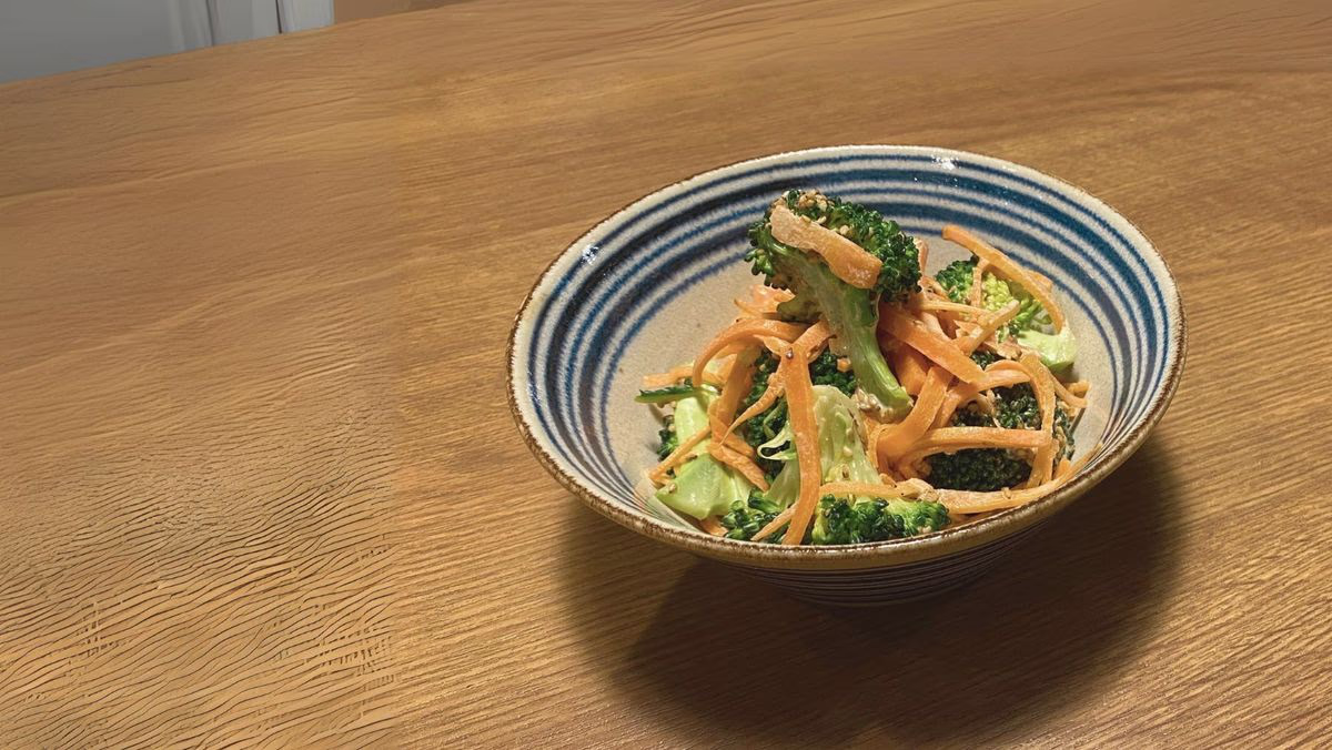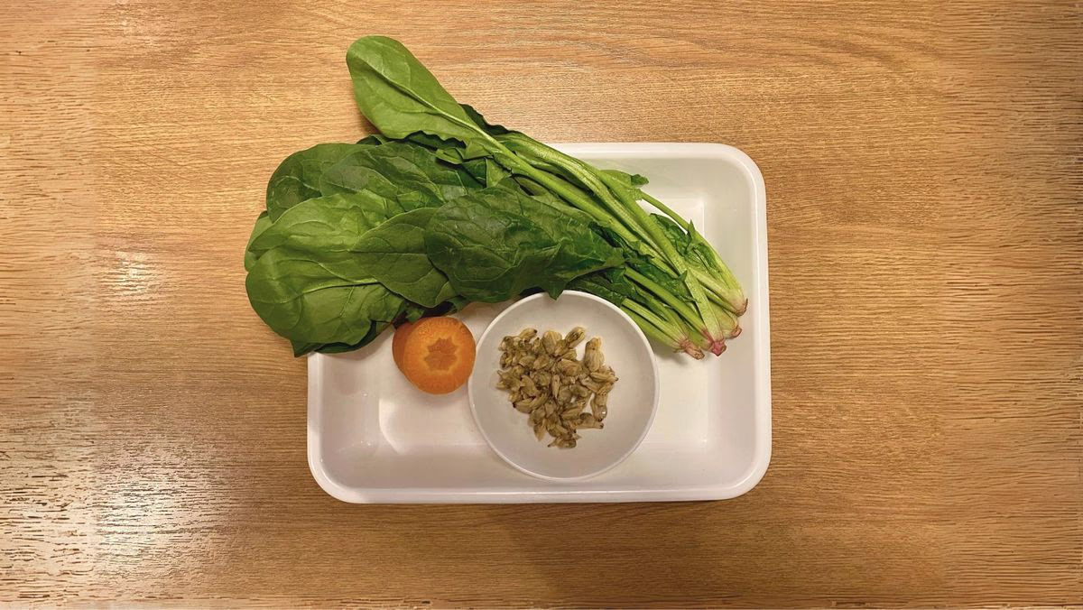 1.ほうれん草(4株)を食べやすい大きさに切り、にんじん(1/3)は千切り。塩を少し入れた熱湯で1分ゆでる。