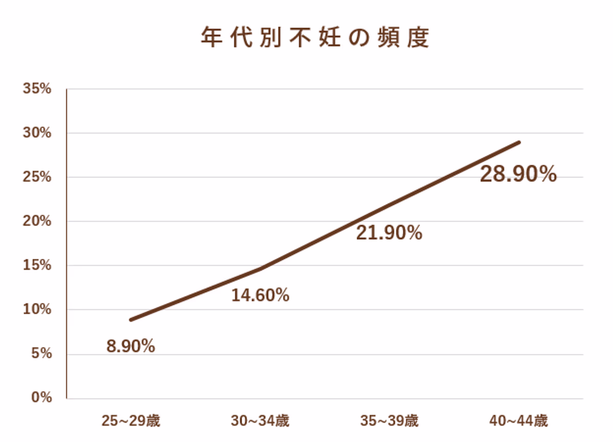 下の図を見ると、年齢が高くなればなるほどに不妊の頻度(≒割合)が高くなっています。