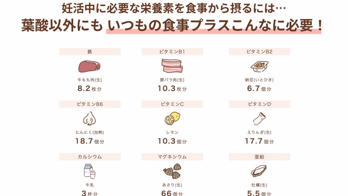 さらに葉酸のほかにも、妊活中に必要な栄養素を食事から摂るには、これだけの量が必要といわれています。