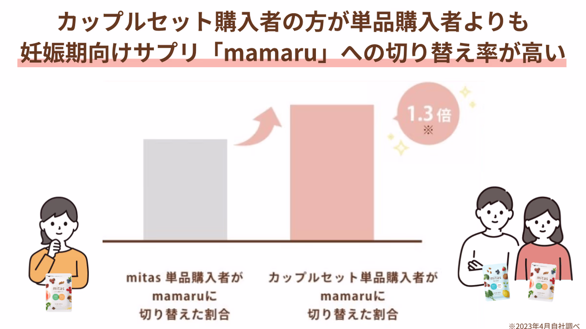 さらに、自社調べによると、女性向けmitasを単体で飲んでいた方よりも、カップルセットを飲んでいたご夫婦のほうが、妊婦さん向けサプリへの移行率が1.3倍も高いというデータも!