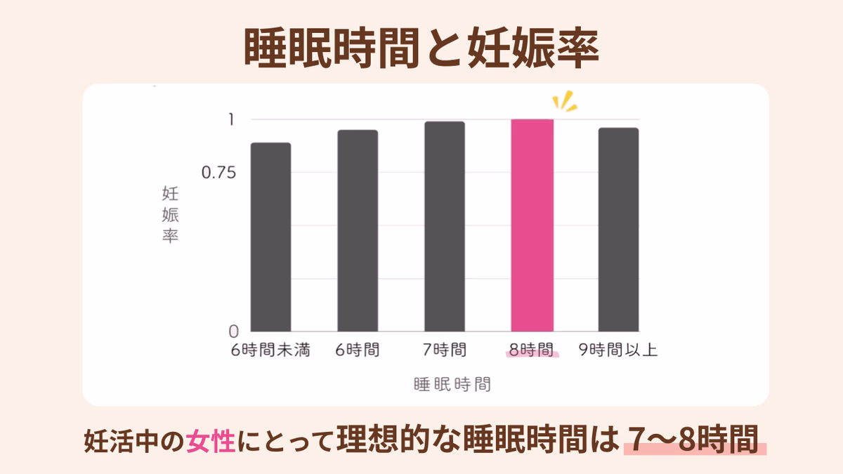 妊娠率をあげたい方にとって、睡眠時間は短すぎず長すぎない7〜8時間がベストと言えるでしょう。
