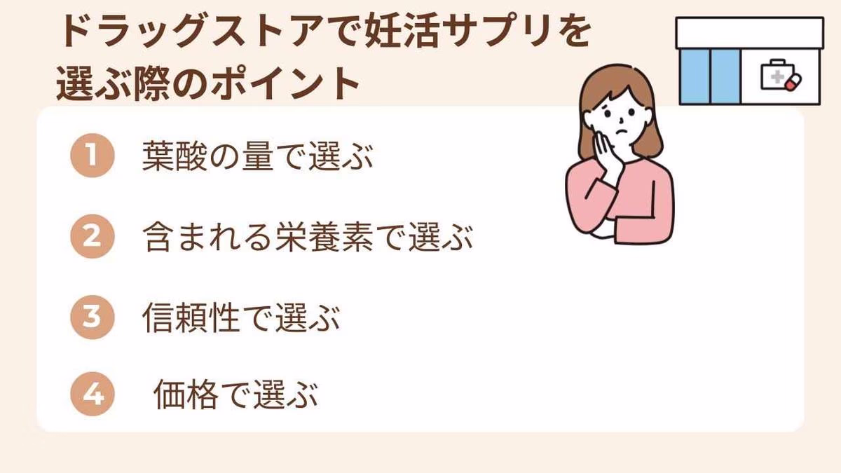 まずは、ドラッグストアで妊活サプリを選ぶ際のポイントをご紹介します。