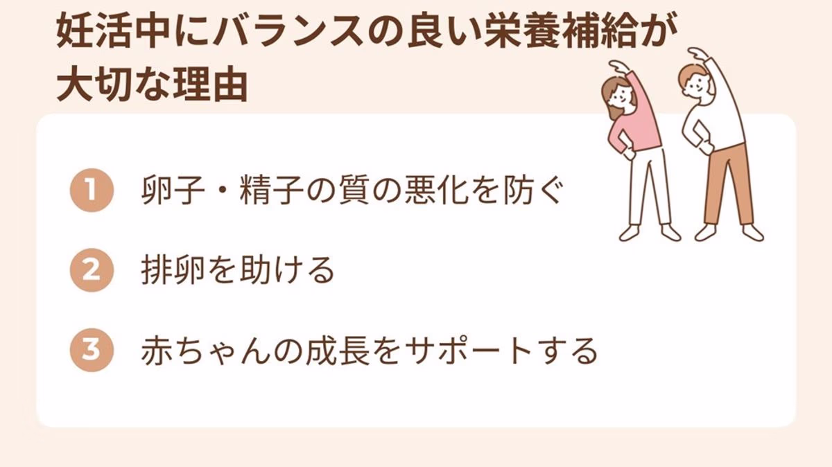 仕事が忙しく食生活が乱れやすい人もいるかもしれませんが、バランスのとれた栄養補給は妊活への近道といえるでしょう。
