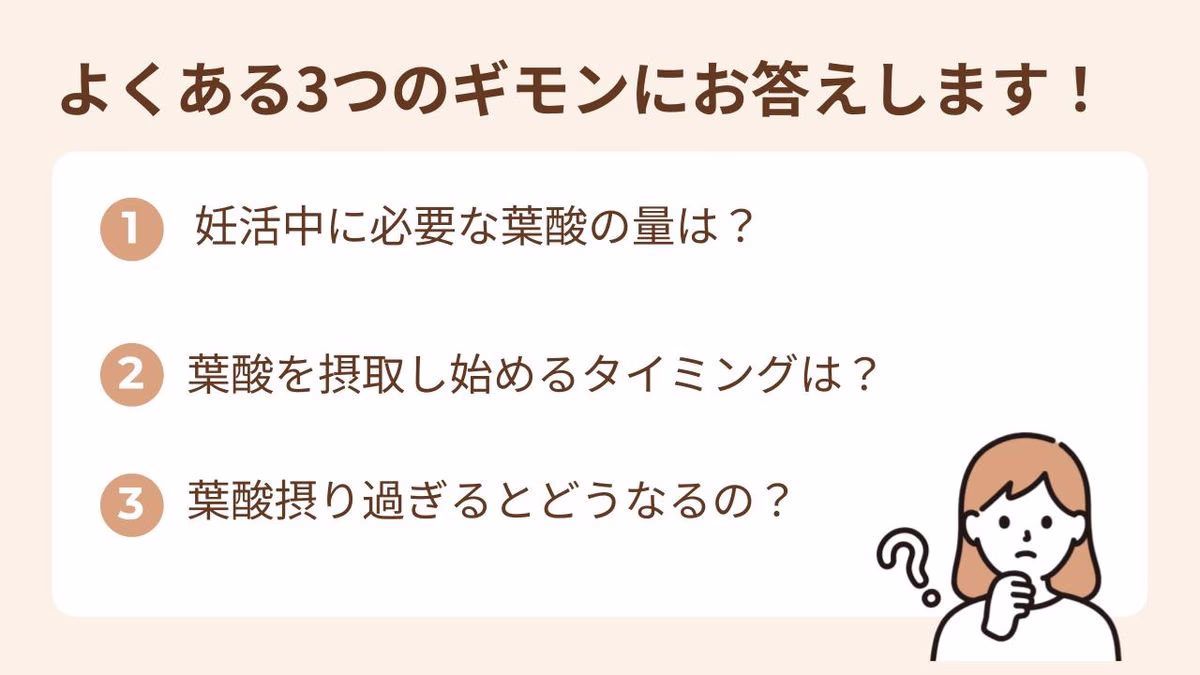 葉酸は妊娠初期に欠かせない栄養素であることが分かりました。ここからは、葉酸の摂取を始める方が抱きやすい3つの疑問にお答えします。