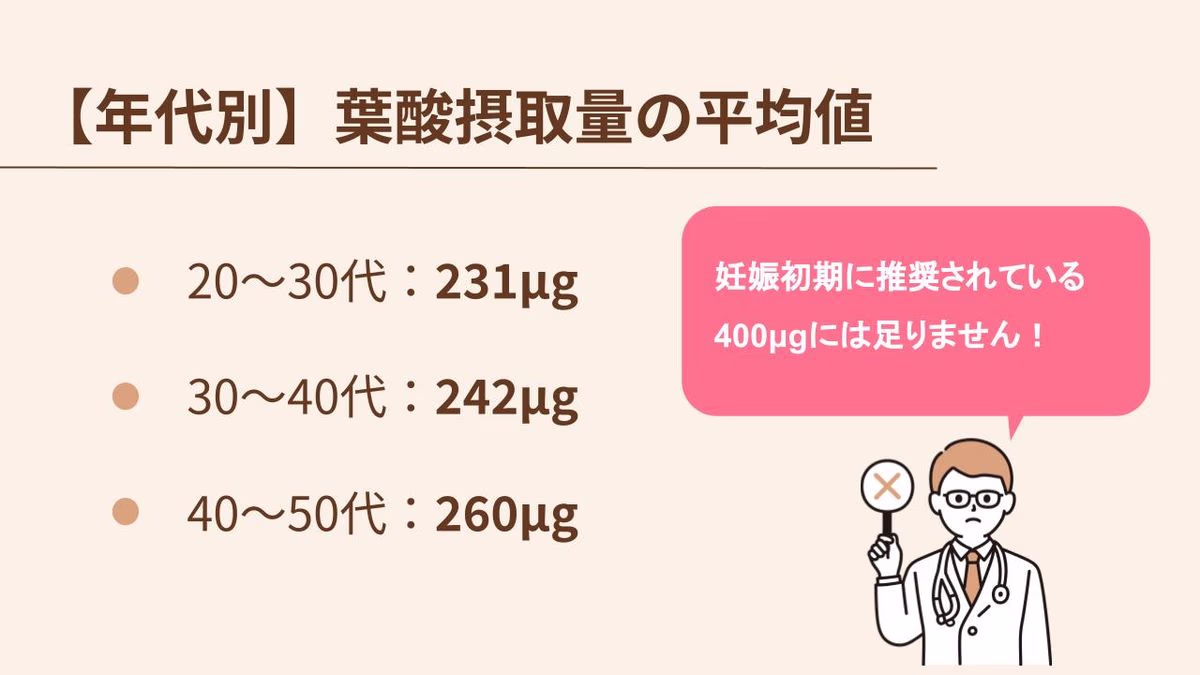 一方で、厚生労働省の調査によると、実際の葉酸摂取量の平均値は次のような結果が出ています。