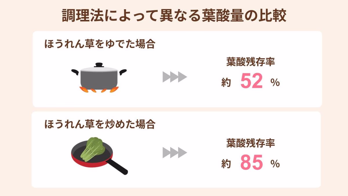 ほうれん草では、茹でるか炒めるかの調理方法の差で、約30%も葉酸の量が変わってしまうのです。