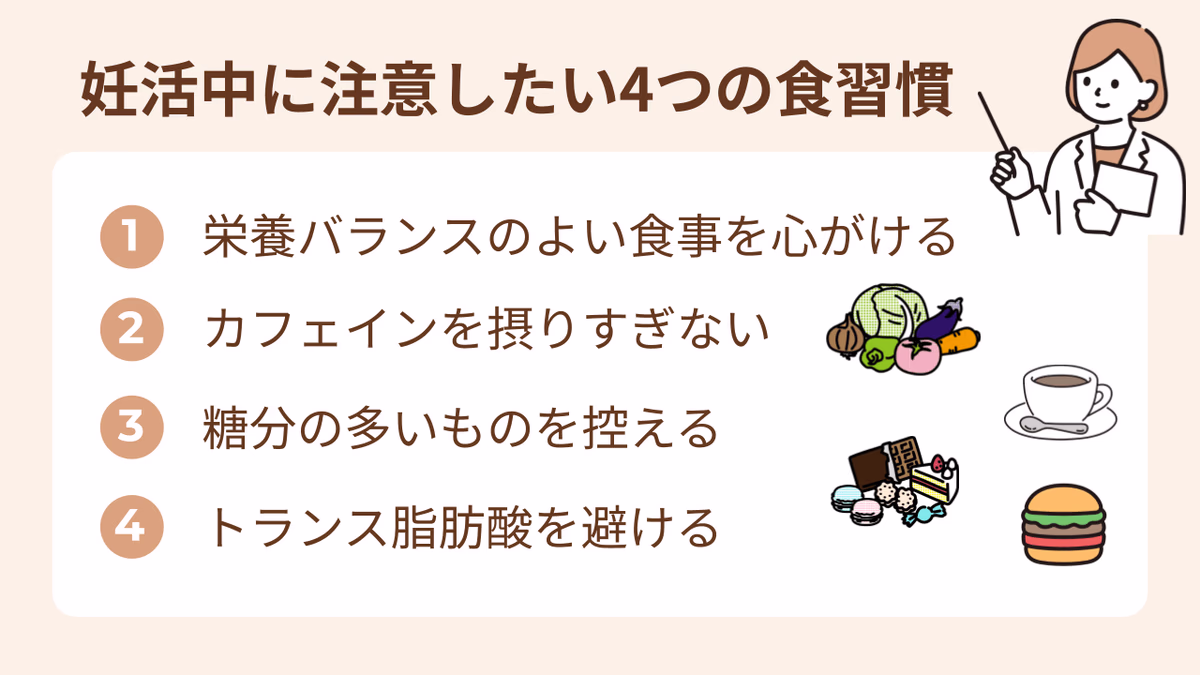 普段からこれらの食品を頻繁に食べる習慣がある場合は、注意が必要です。健康的な食生活を意識し、少しずつ食習慣を見直すことが妊活成功のカギとなります。