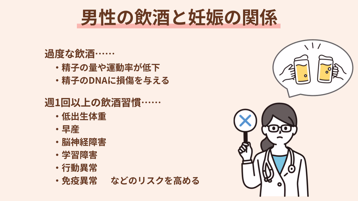 また、男性に週1回以上の飲酒習慣があった場合、出生児・乳児の低出生体重・早産・脳神経障害・学習障害・行動異常・免疫異常などのリスクを高める可能性も示唆されています(※4)。